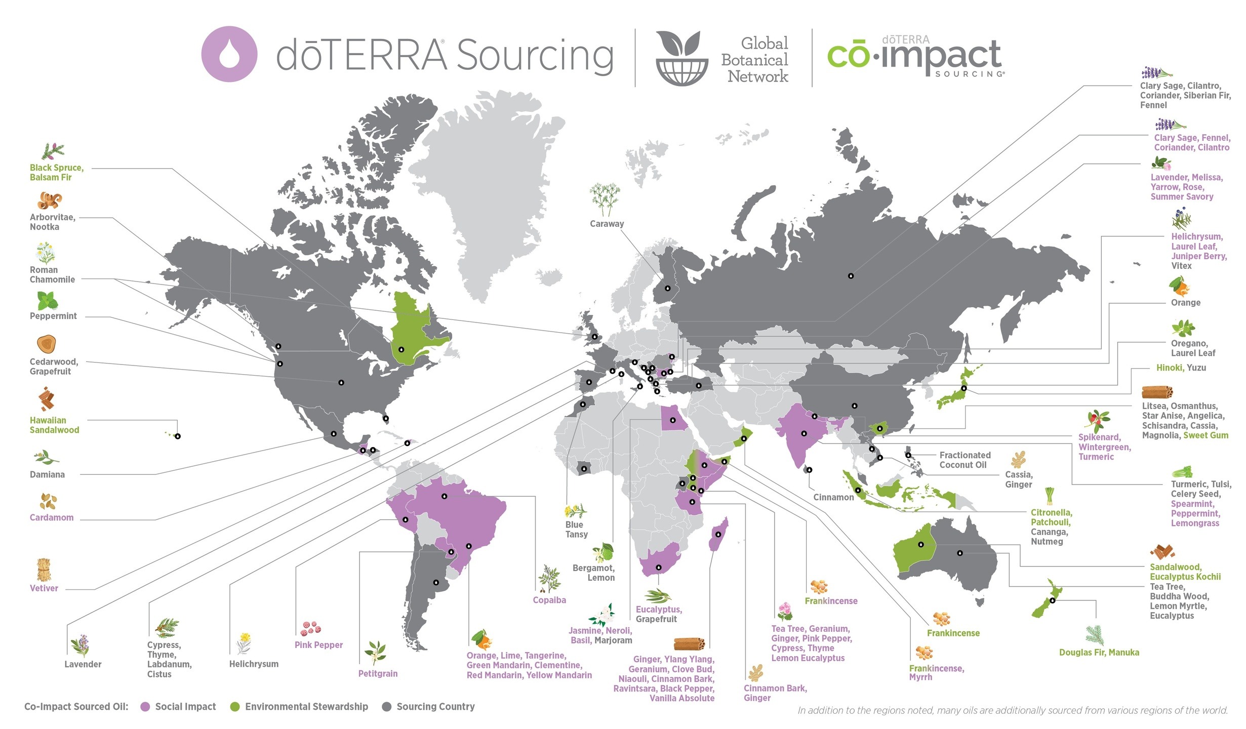 Con oltre 140 oli nella sua linea di prodotti, doTERRA reperisce i suoi oli in più di 145 paesi, più della metà dei quali possono essere considerati in via di sviluppo. Per assicurare che i piccoli agricoltori e raccoglitori nelle aree svantaggiate siano trattati in modo etico, doTERRA ha introdotto un’iniziativa chiamata Co-Impact Sourcing.